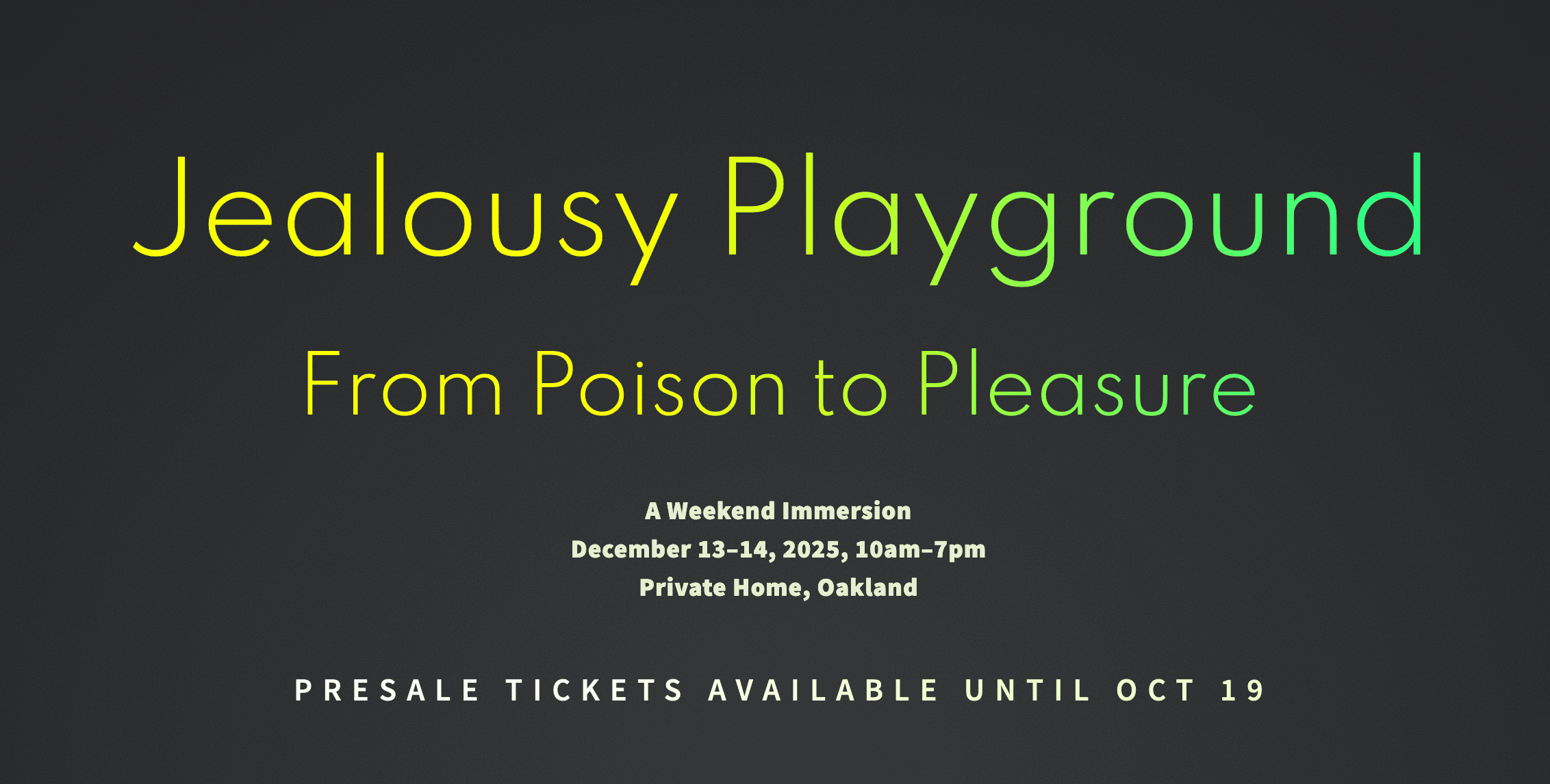 A Weekend Immersion | December 13–14, Oakland Jealousy. That raw, electric emotion we're taught to fear, avoid, or hide. But what if jealousy isn't poison at all? What if it's the doorway to deeper pleasure? In this weekend immersion, we'll explore jealousy not as something to fix, but as a powerful portal into eros, truth, and liberation. We'll transmute what once felt toxic into something deliciously alive—turning poison into pleasure, shadow into fuel. I'm honored to co-facilitate with two extraordinary teachers: